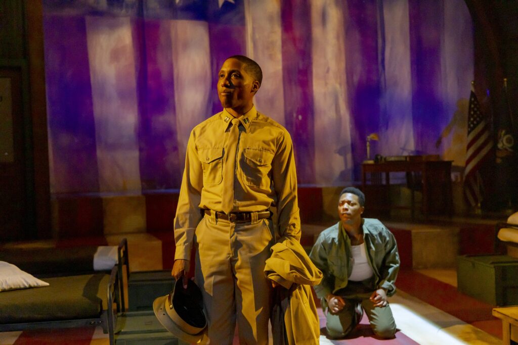 The set, designed by Jon Savage, is sharp and crisp. Period appropriate pieces by Moira Seger include authentic military beds, storage chests, and ornamental desks that look straight from the 1940s. I marveled at the large American Flag draped behind the lower stage, which reveals to be transparent, allowing later flashback scenes to show the action with haunting clarity. The Stage Managers, Danitza Piper and Tessa Killen, keep the show moving gracefully through the stage’s levels and multiple escape doors throughout the theater. All of this is complete with Sound and Music from Derek G. Graham and R.M. Lawrence which add to the show’s tight pacing and atmosphere.