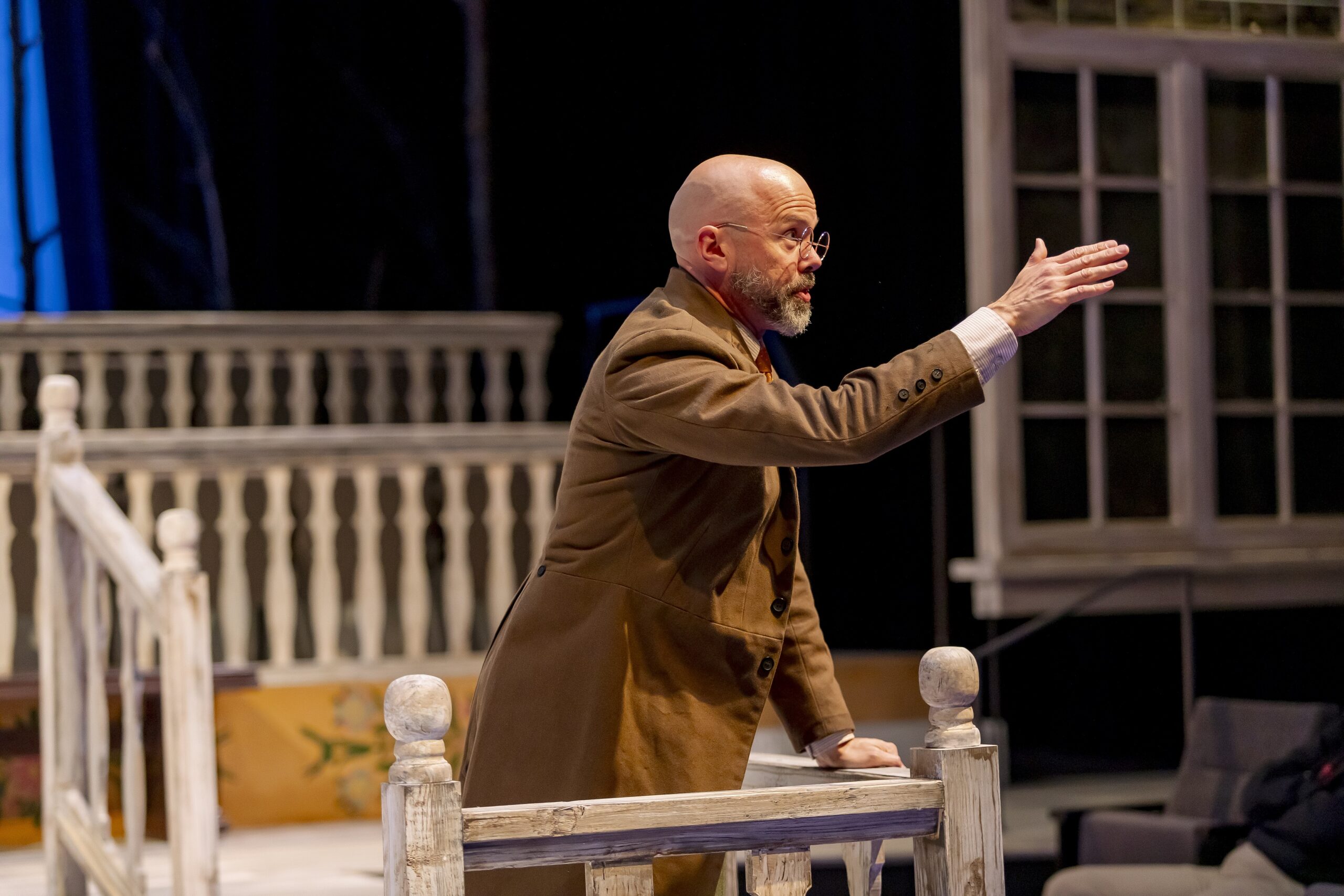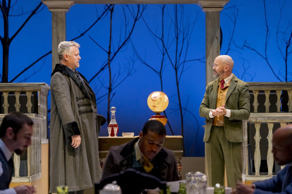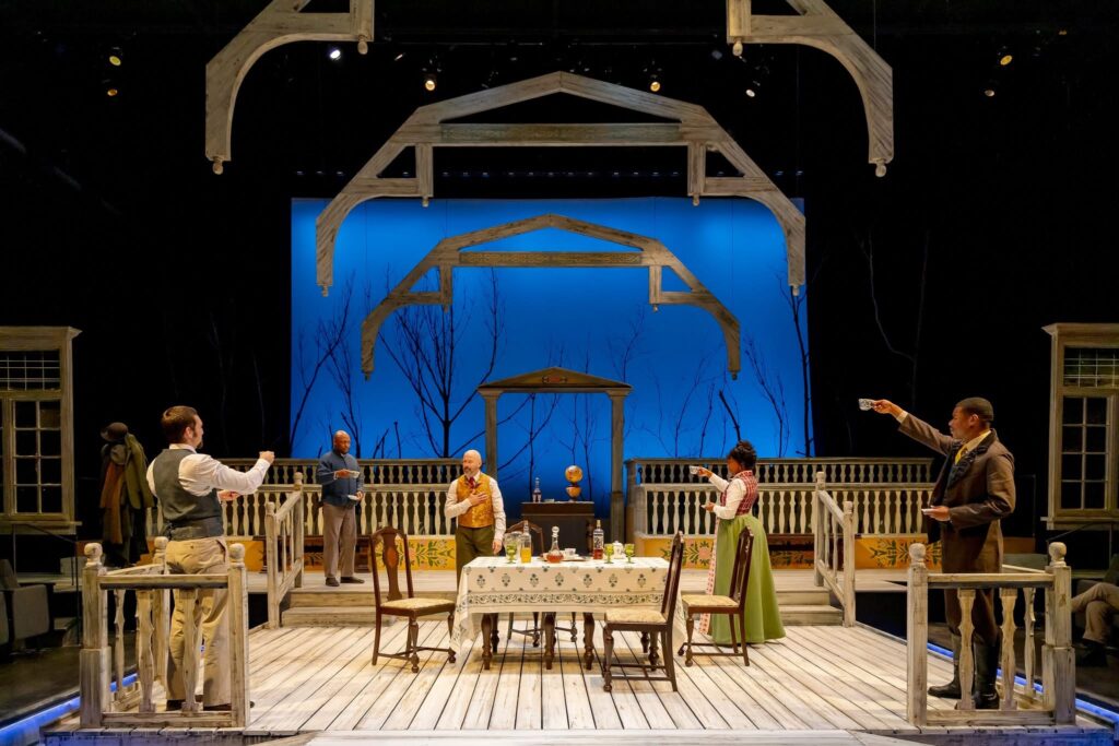 The set is gorgeous. Jon Savage built a mansion and a moat with seating on stage that is rivaled only by the lights and costumes that Baxter Chambers and Erin Carter, respectively, provide. I greatly enjoyed the notes throughout the program by Dramaturg Tamara Winters. The notes provide historical insight on the world of the play and explain the use of water is both metaphorical and a strong reminder of the town itself.