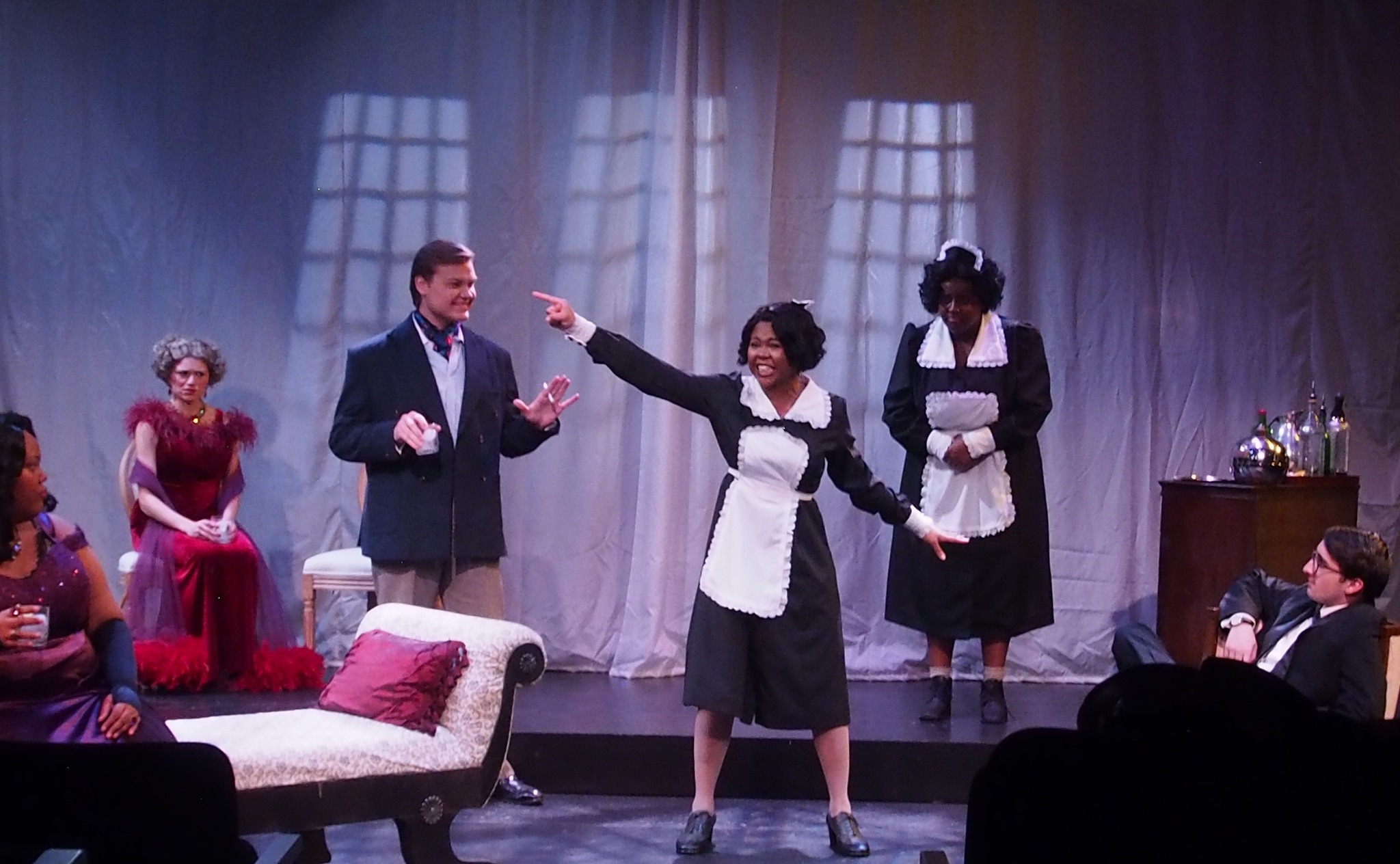 Gion DeFrancesco’s scenery balances the needs of the space with the demands of the production. He includes multiple curtains and some lovely moveable furniture pieces. Student Mary Johnston-Medina provides thoughtful lighting design that helps guide audience focus, assisted by Marly Wooster. Numerous sound effects (Trey Tatum)—from radio music to doorbells, telephones, and film clips—support the storytelling.