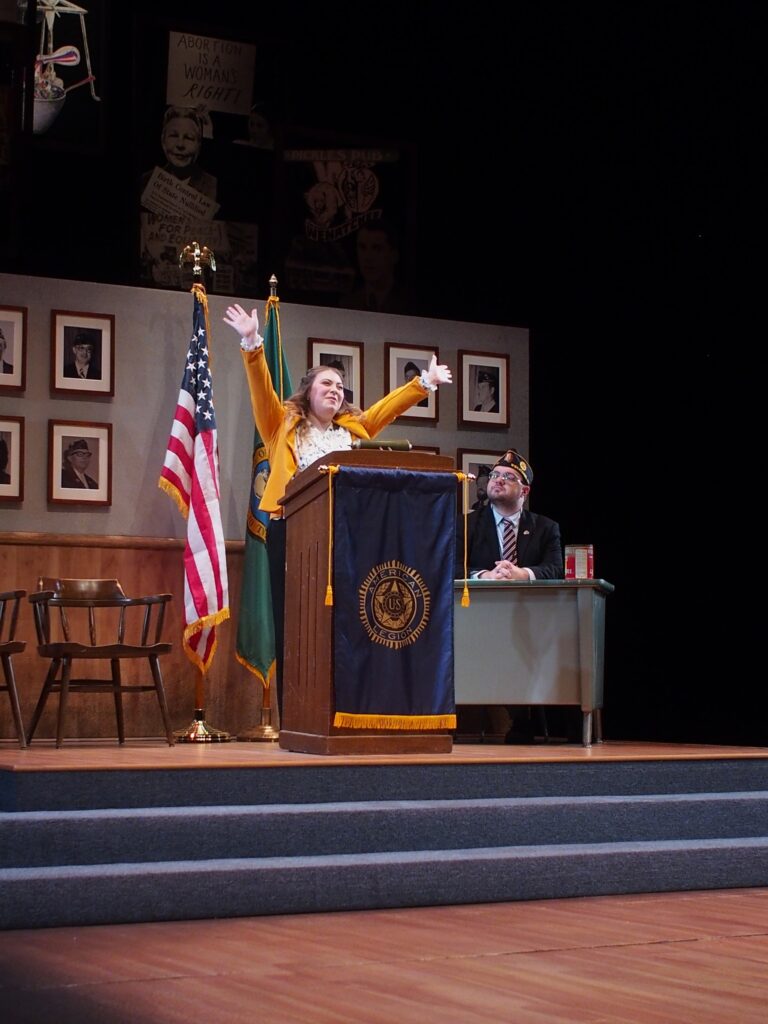 The production is structured in two parts. First, 15-year-old Heidi (Sara Rose Detwiler) delivers her contest speech, focusing especially on the Ninth Amendment, which Schreck describes as the Constitution’s “penumbra,” or the shadowy areas open for interpretation. Through Heidi’s perspective, the audience learns of her mother, grandmother, and great-great-grandmother, whose lives were shaped by gaps and interpretations of the law. The second part of the first section introduces the Legionnaire, Mike, who is performer Garland Weaver. Mike shares about gender and gender signaling.