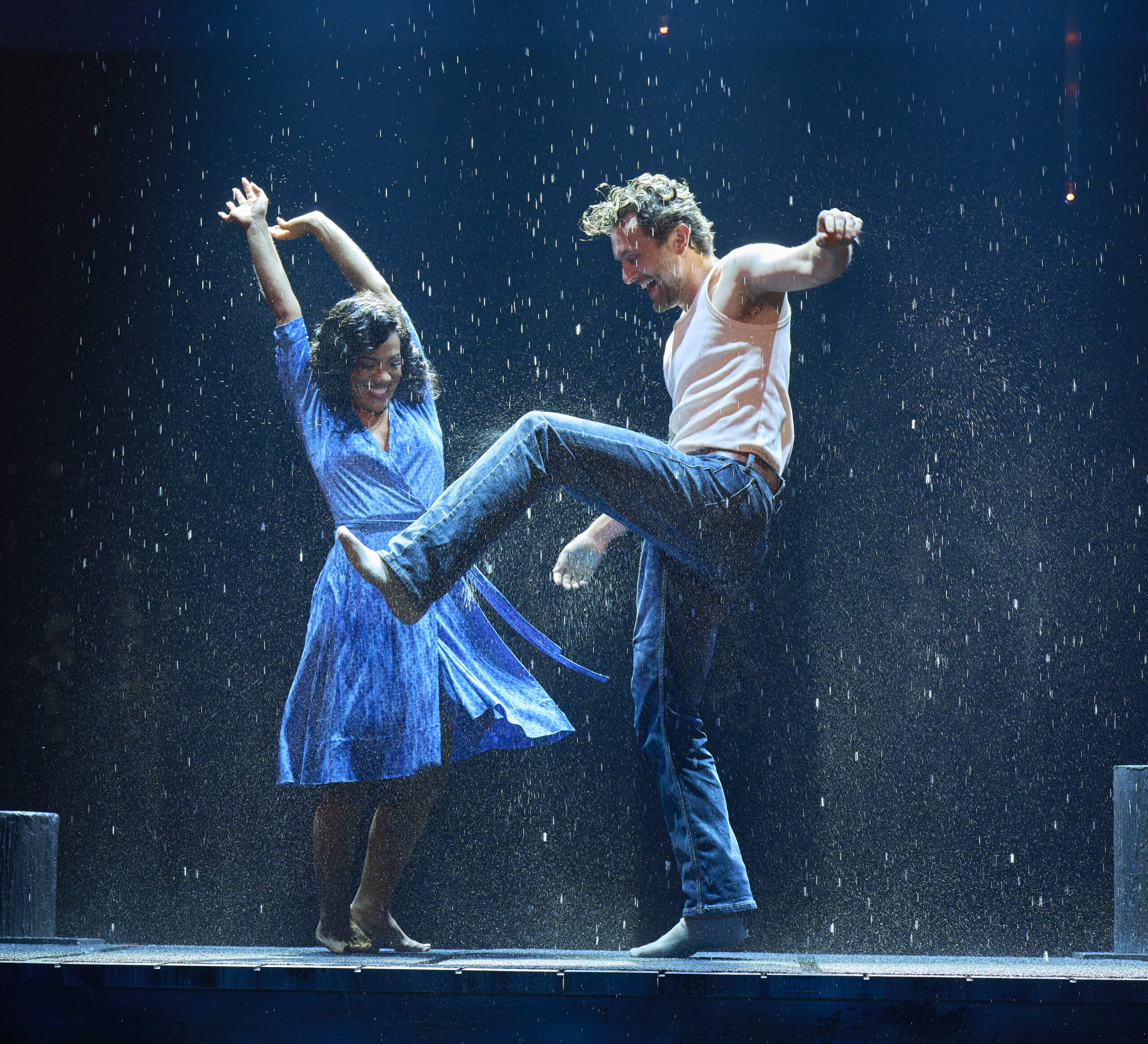The tech in The Notebook takes this to another level. About 30 vertical LED lights hang from the ceiling. Throughout the show they change color, height, and illumination to create rooftops, moods, and all over variety to the show. The front of the stage has a rocky path through a “pond” that the cast frequently skips through. And, a technical highlight is the iconic rainstorm in the middle of Act Two where Noah and Allie share a romantic encounter.