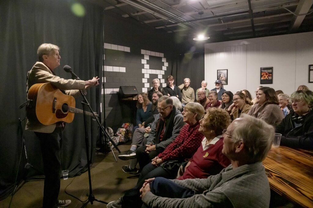 Image from Cincinnati Storytelling Festival 2024, Andy Offutt Irwin on stage. Photo credit Mikki-Schaffner.