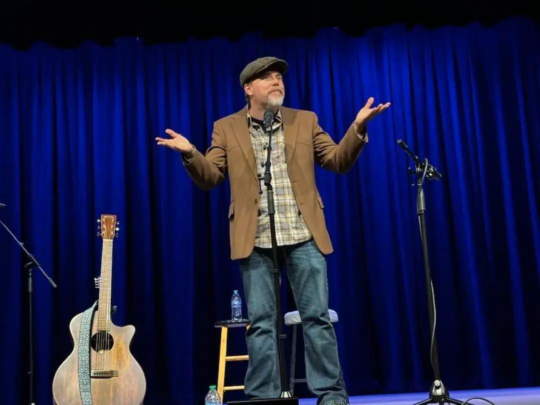 Image from Cincinnati Storytelling Festival 2024, Andy Offutt Irwin on stage. Photo credit Mikki-Schaffner.